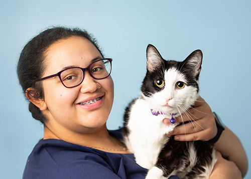 Jalyn grew up in Thornton, Colorado. As someone who grew up with many animals, she has always loved being around them and interacting with them. She knew from the age of 5 that she wanted to work with animals and do what she could to help them. After graduating from Thornton High School, she attended Pima Medical Institute to further her education on working with animals. Jalyn has two rescues, a dog named Mocha and a cat named Elvis. She is planning to rescue more animals in the future. When she’s not working she enjoys hiking, watching movies, writing, playing video games, drawing and crocheting.